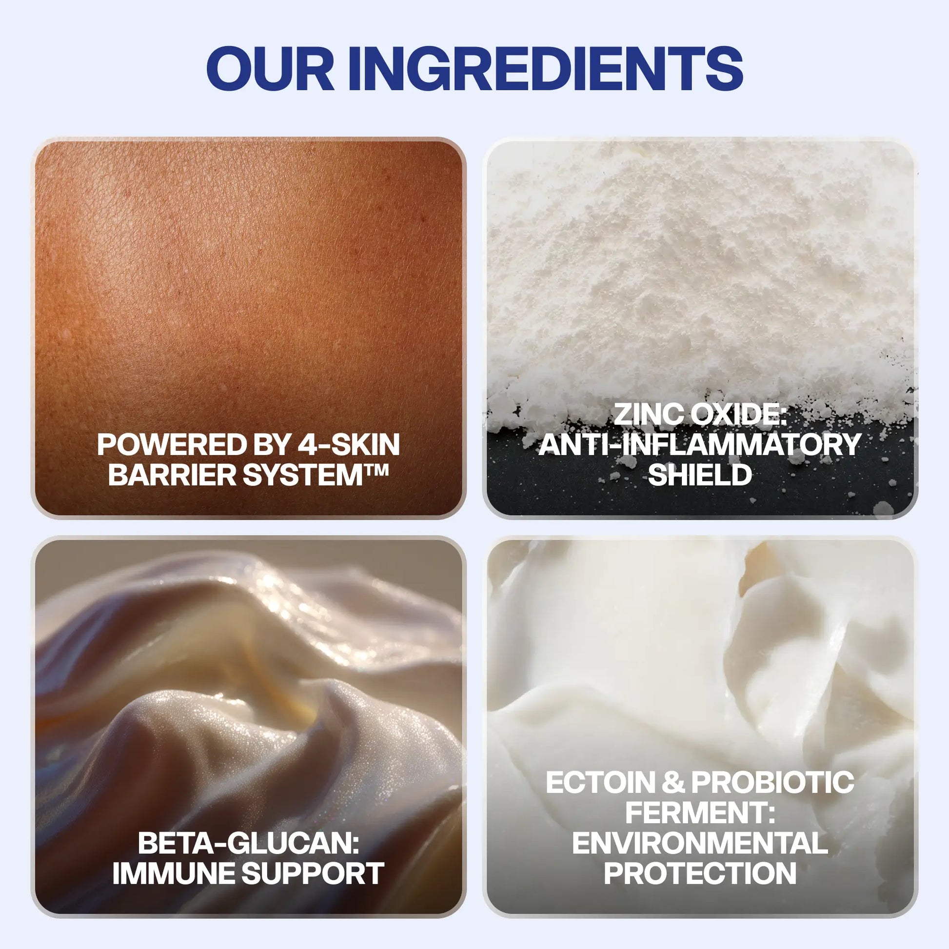 Zinc Oxide, Centella Asiatica, Ectoin, and Beta-Glucan to cool, protect, and support repair.